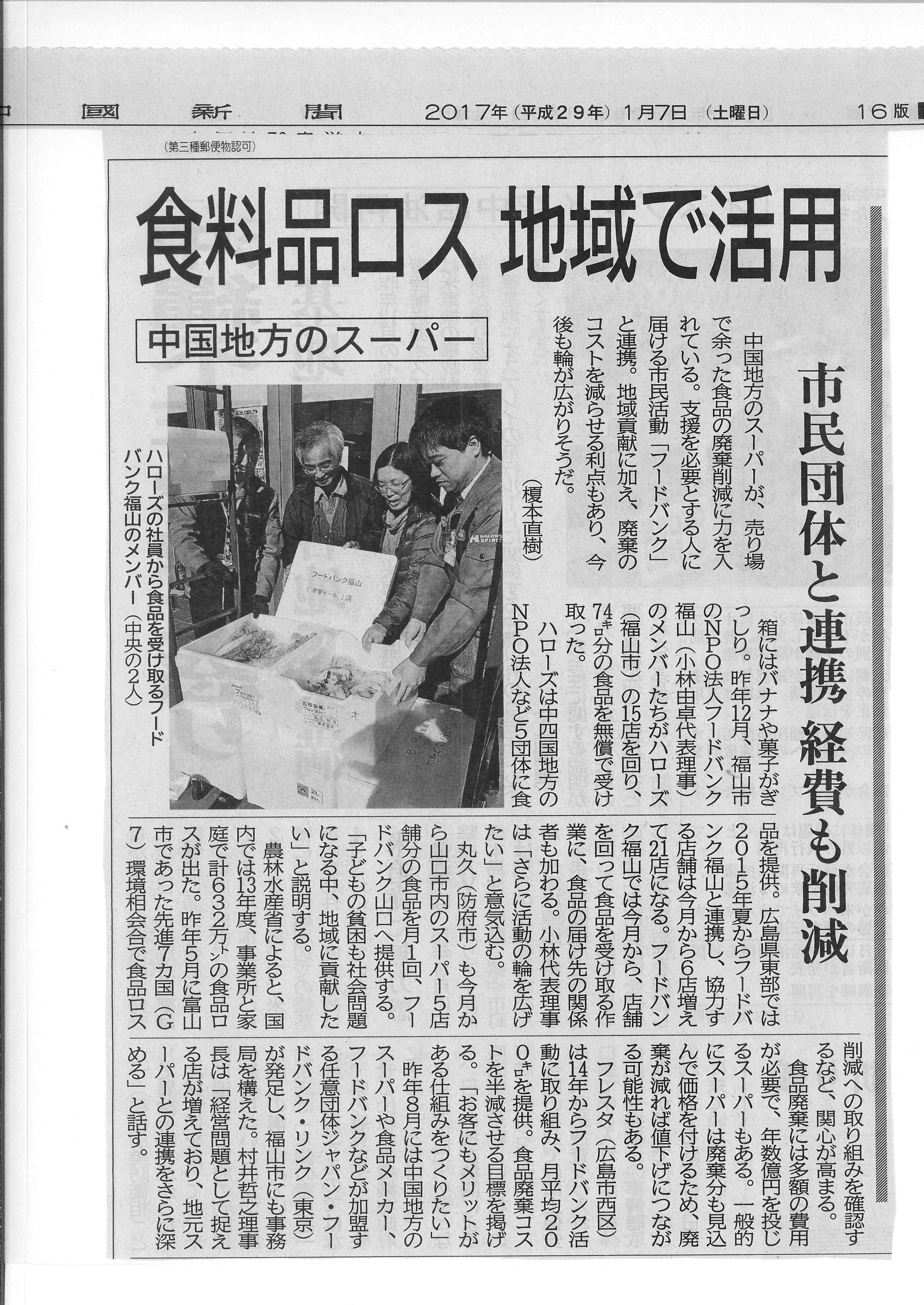 【NPO法人フードバンク福山/株式会社ハローズ/ジャパン・フードバンク・リンク】中国新聞 食品ロス地域で活用-市民団体と連携 経費も削減-