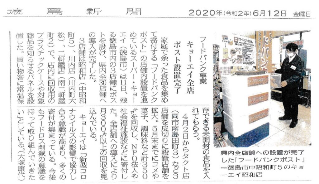 2020年6月12日付徳島新聞に、JFL会員スーパーの(株)キョーエイ様(本部:徳島市)のフードバンクポストへの取組が掲載されました。