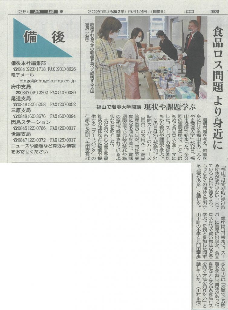 2020年9月13日付中国新聞(備後版)に、JFL会員スーパーの(株)ハローズ様(本部:岡山県早島町)が広島県福山市主催の講座「ふくやま環境大学」にて講演を行ったことが掲載されました。