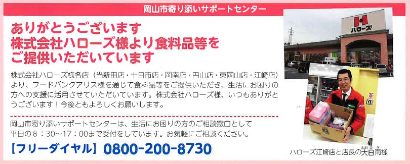 岡山市内のハローズ6店舗より食品等の提供を受け、生活困窮者への支援に活用されています。ハローズモデル(店舗直接提供システム)により、フードバンク、提供スーパー双方の負担が軽減され、低コストかつ継続的な活動が可能となっています。