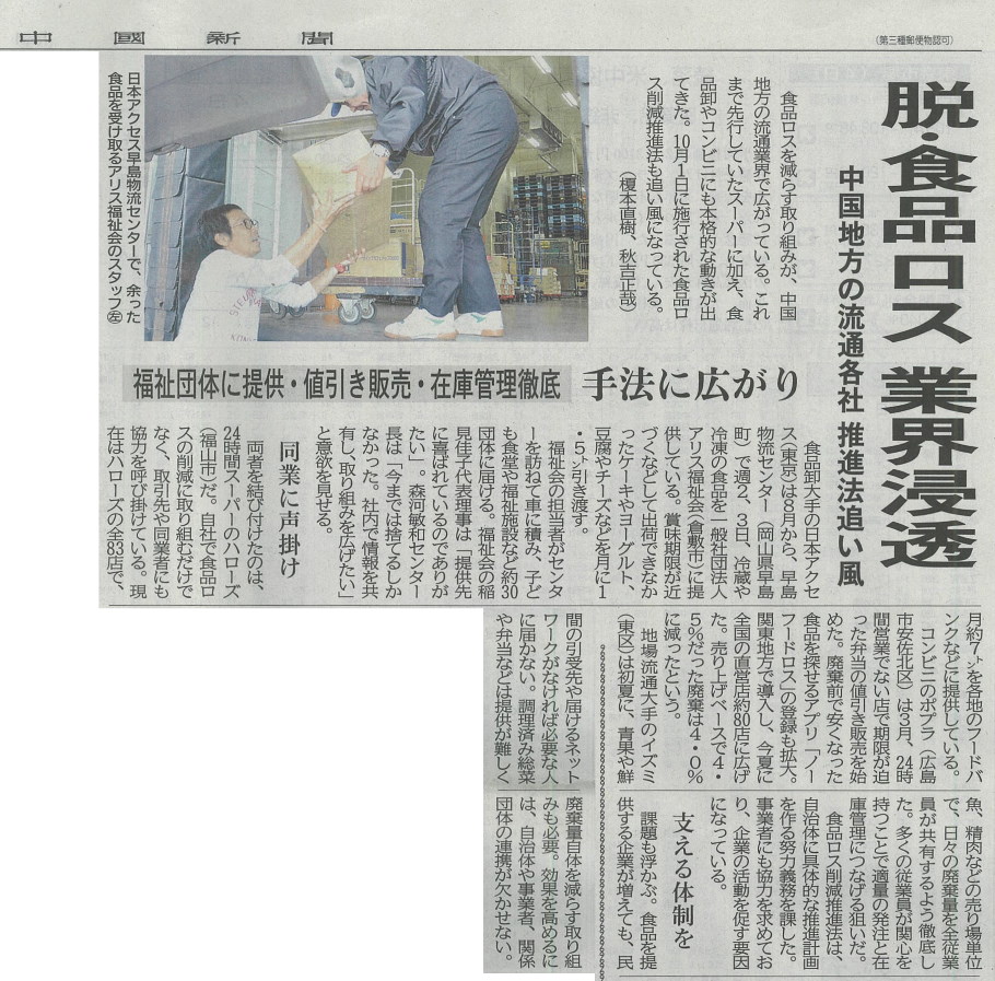 2019年12月5日付中国新聞に、JFL会員食品卸売業の(株)日本アクセス様(本社:東京都品川区)の岡山支店(岡山県早島町)とJFL西日本事務局・フードバンクアリスへの冷蔵・冷凍品提供の取組が掲載されました。