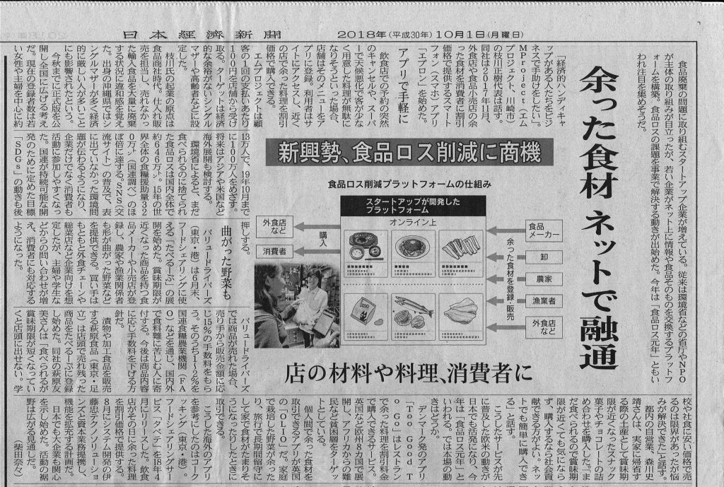 2018年10月1日付日経新聞に、スマホアプリで食品ロス削減に取り組むスタートアップ企業が紹介されました。
