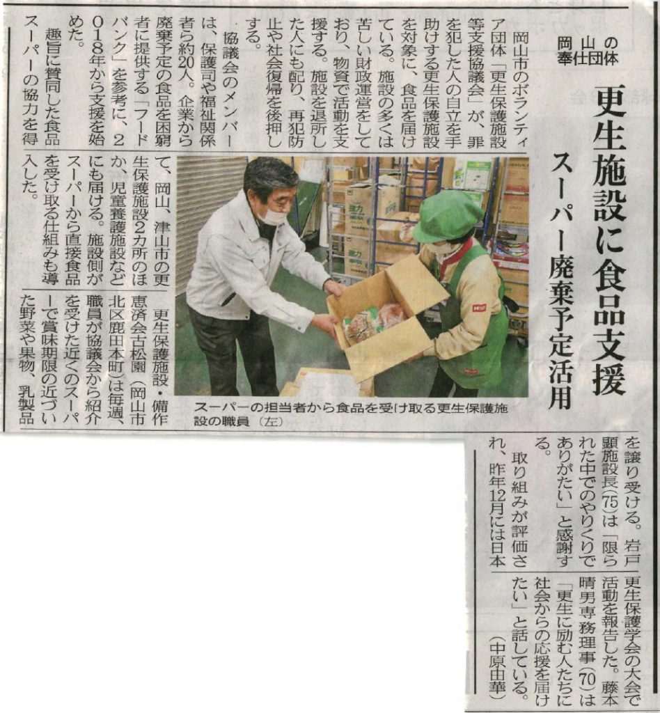 2021年1月25日付山陽新聞に、JFL会員フードバンクの更生保護施設等支援協議会様(岡山県津山市)の取組が掲載されました。